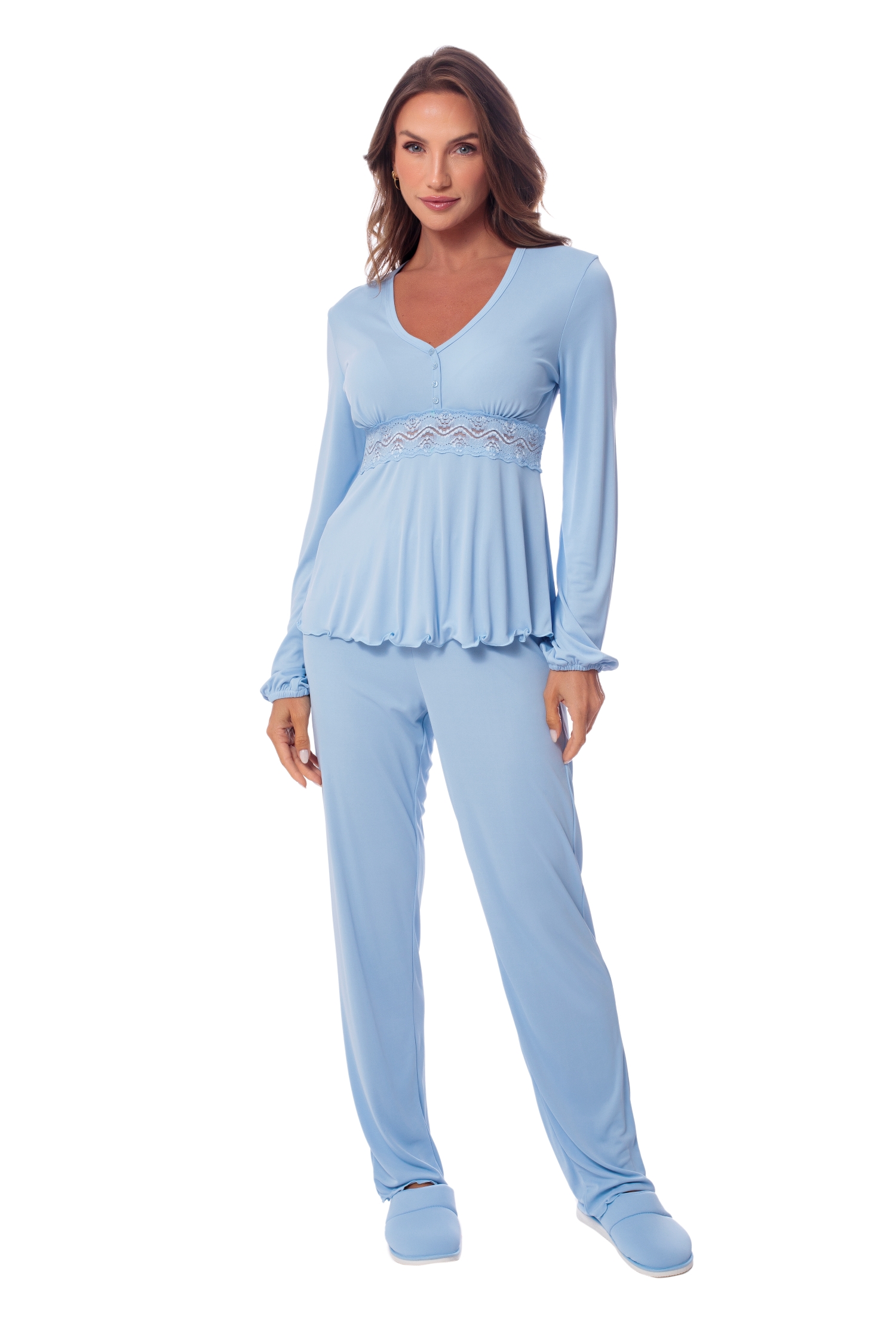 O pijama Viviane é delicado e romântico. Modelagem trabalhada em poliamida plume, possui recortes que sustentam os seios com abertura falsa e mini botões fixos. Logo abaixo do busto um cós de renda realça a cintura, trazendo muita feminilidade. A calça é solta e com excelente caimento. A malha plume foi desenvolvida a partir da perfeita combinação entre o design e a inovadora tecnologia da poliamida Amni, proporcionando respirabilidade, fácil lavagem e secagem, artigo produzido de forma sustentável.