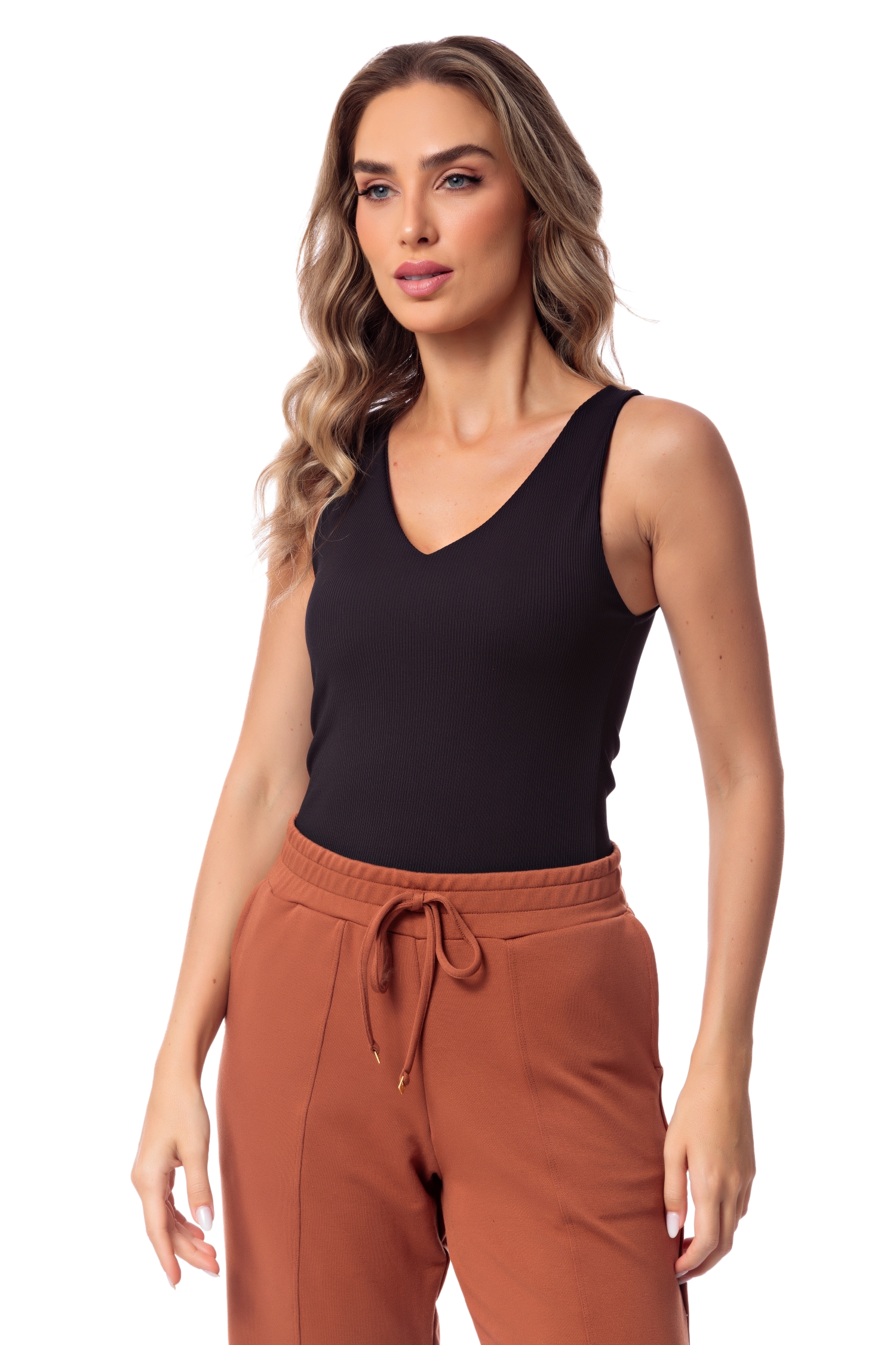 De modelagem ajustada ao corpo e decote V, que alonga a silhueta, esta regata nunca sai de moda, sendo uma grande aliada na composição dos mais diversos looks. Produzida em Canelado Fashion, um canelado de poliamida extremamente fresco e macio, com o toque de malha fria.