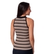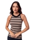Blusa básica tipo regata, em malha canelada Maitê listrada com acabamentos em malha canelada lisa. Este artigo traz todo o frescor da viscose com a flexibilidade e conforto do elastano. Uma perfeita combinação de cores em um modelo atemporal e curinga que facilmente faz composição com shorts, saias e calças. Modelagem ajustada ao corpo, mas que se adapta aos mais diversos biotipos devido ao canelado característico desta malha. O diferencial desta regata está nos acabamentos realizados com dois tipos de aparelhos de viés, um estreito nas cavas e outro largo na parte superior, formando um um lindo decote.