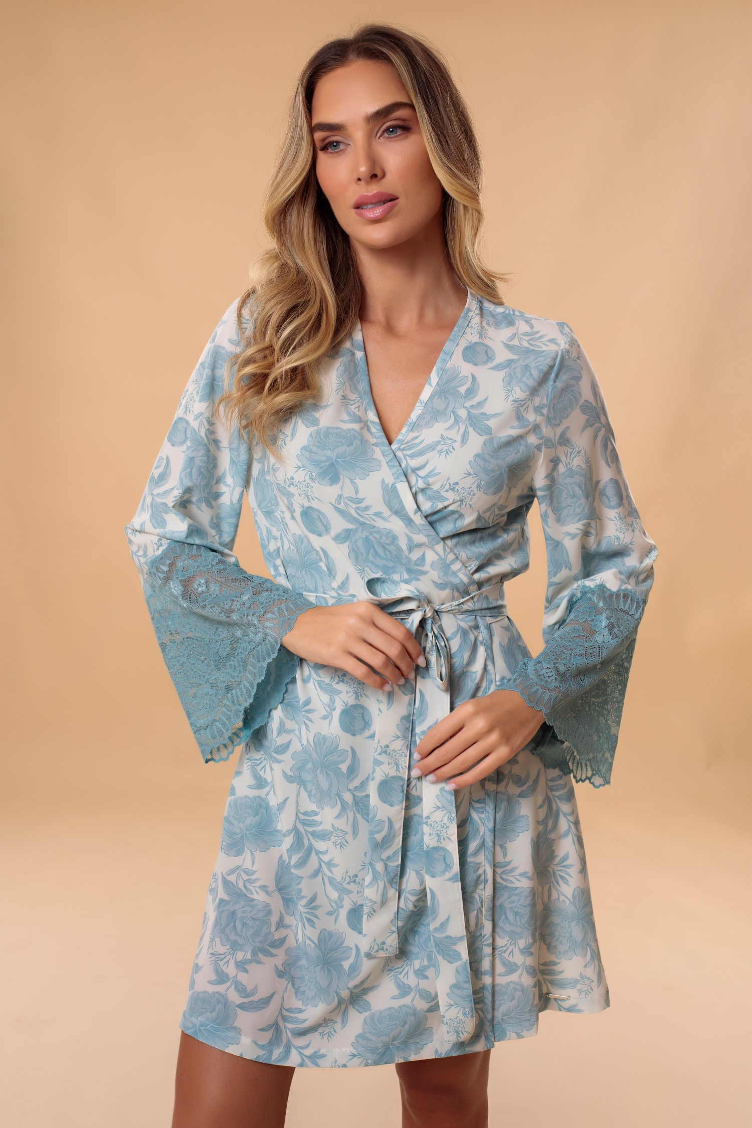 Robe clássico em tecido plano estampado floral bicolor, desenvolvido para compor com os mais diversos produtos desta coleção. O tecido Milos é leve e fininho, e conta com o elastano em sua composição a fim de proporcionar maior conforto. A modelagem transpassa na frente, tipo envelope, trazendo regulagem e segurança para todos os biotipos. Um barrado largo em renda chantilly nas mangas completam o charme e a feminilidade da peça. Um modelo útil e atemporal que agrada mulheres de todas as faixa etárias.