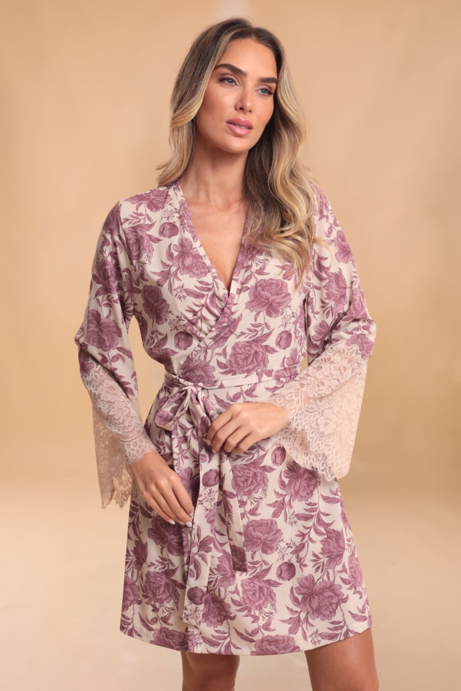 Robe clássico em tecido plano estampado floral bicolor, desenvolvido para compor com os mais diversos produtos desta coleção. O tecido Milos é leve e fininho, e conta com o elastano em sua composição a fim de proporcionar maior conforto. A modelagem transpassa na frente, tipo envelope, trazendo regulagem e segurança para todos os biotipos. Um barrado largo em renda chantilly nas mangas completam o charme e a feminilidade da peça. Um modelo útil e atemporal que agrada mulheres de todas as faixa etárias.