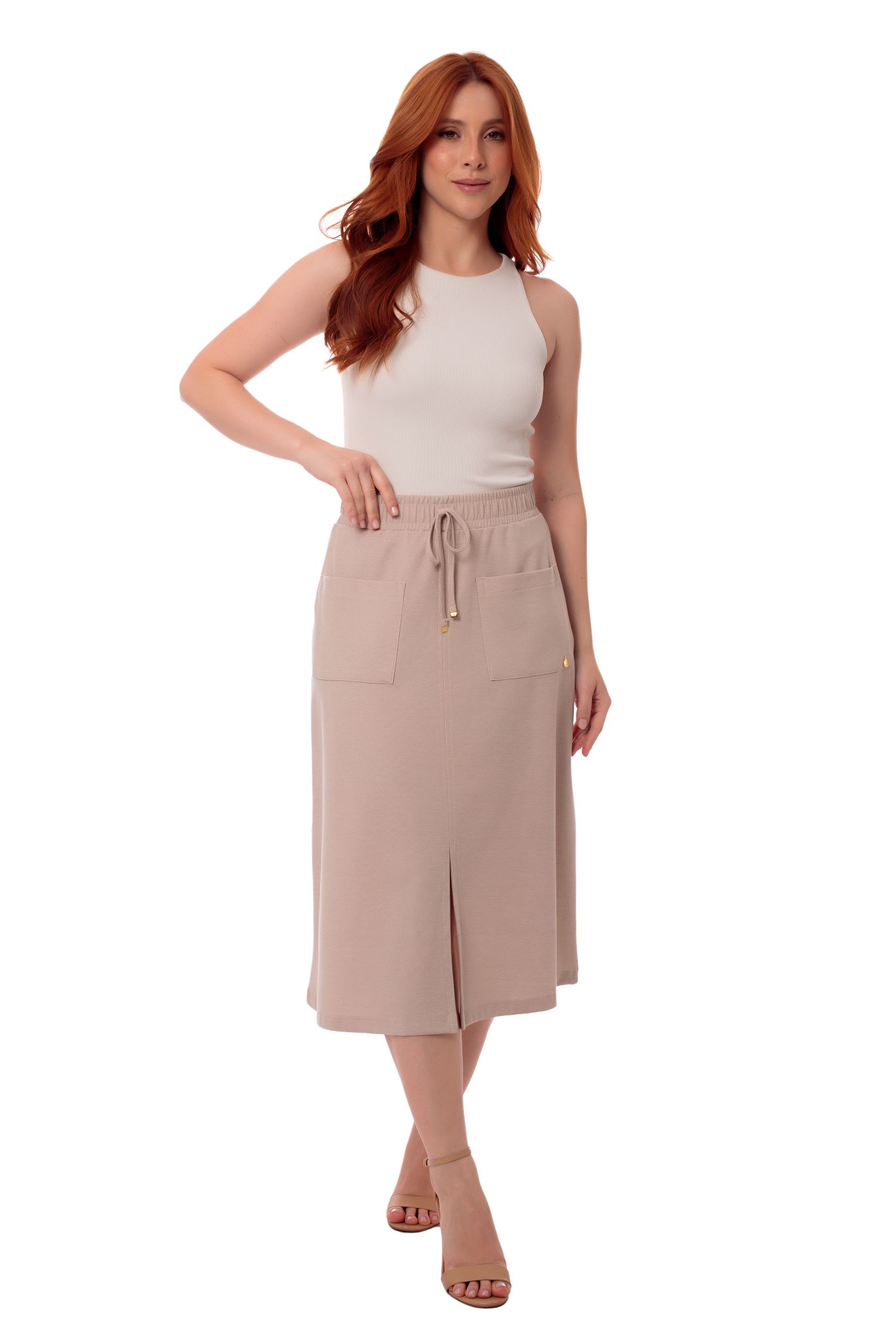 Saia confeccionada em tecido misto de viscose, poliéster e elastano, combinando leveza, maciez, boa elasticidade e resistência. Possui cós com elástico embutido que se ajusta confortavelmente ao corpo, além de cordão decorativo (sem função de ajuste), que acrescenta um toque casual à peça. O modelo conta com dois bolsos frontais de recorte quadrado, que trazem funcionalidade e um visual despojado. A fenda central na parte frontal da saia adiciona movimento e feminilidade ao look, conferindo leveza e modernidade ao caminhar. Ideal para composições que equilibram conforto e estilo.