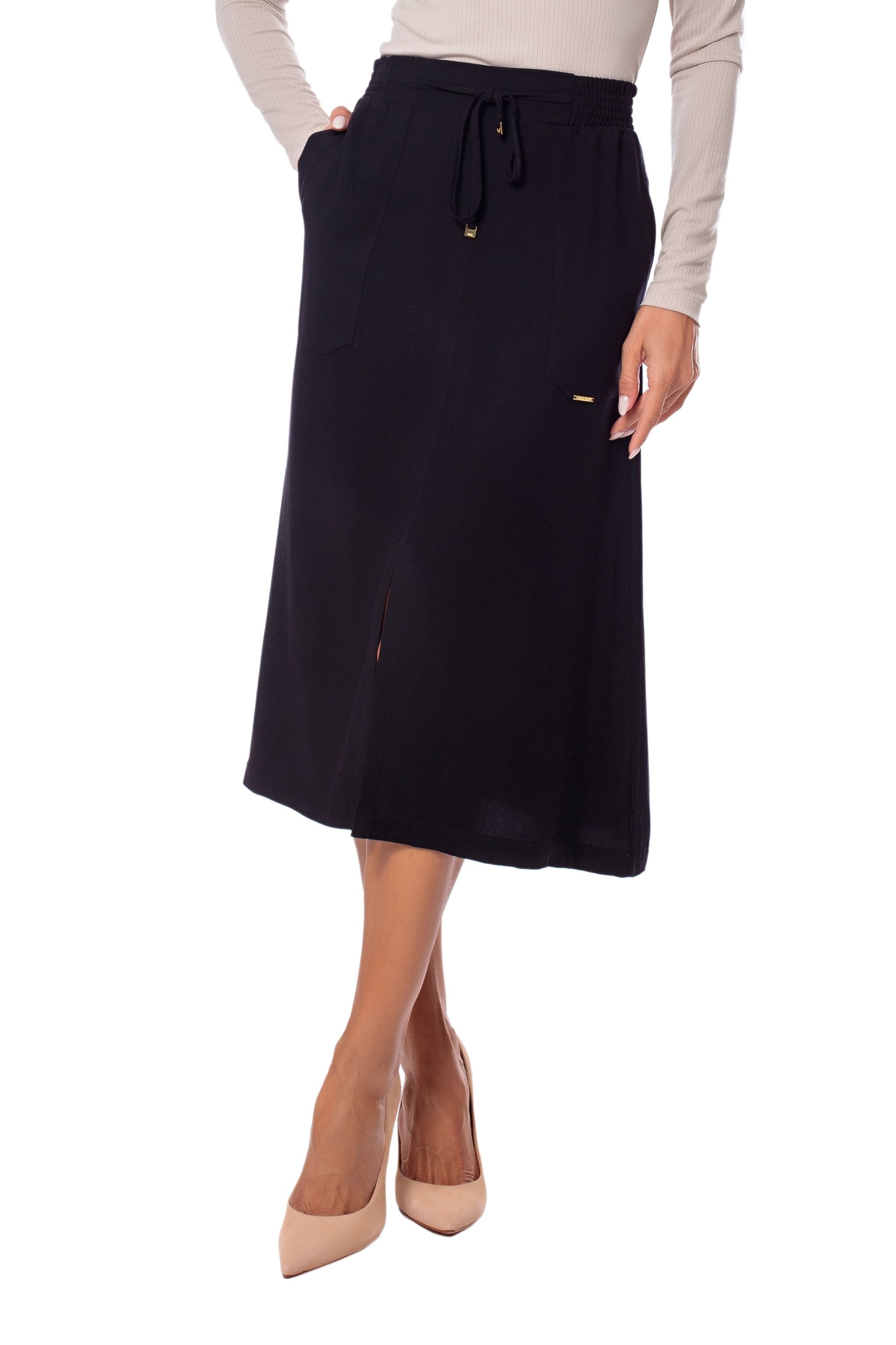 Produzida em Viscolinho Cingapura, esta é uma saia elegante e versátil. Sua modelagem evasê valoriza diversos biotipos, deixando a mulher feminina e confortável. Na composição do tecido, a junção de duas fibras nobres: a viscose e o linho, que dão origem a uma peça de aspecto rústico e natural.
