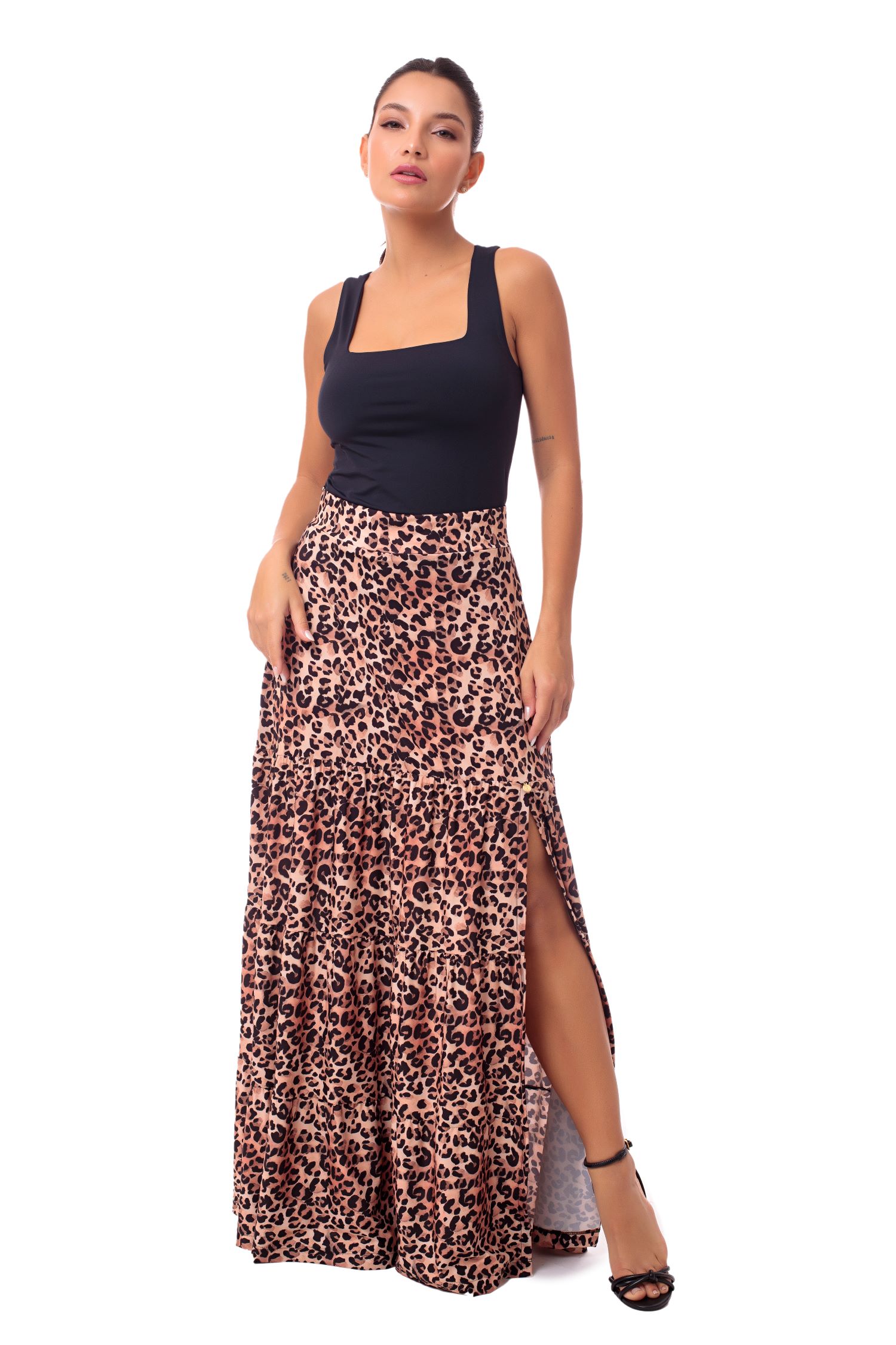 Aqui a DN Casual traz uma proposta de saia estampada e longa. A saia Valéria tem a modelagem em camadas franzidas no estilo ?3 marias?, o que lhe confere amplitude e frescor. Na frente uma fenda traz movimento e um ar de sensualidade ao modelo longo. A malha touch light selecionada para esta saia, é fina, leve e tem um toque fresco. As estampas que remetem ao animal print são clássicas e sempre têm espaço no cenário da moda