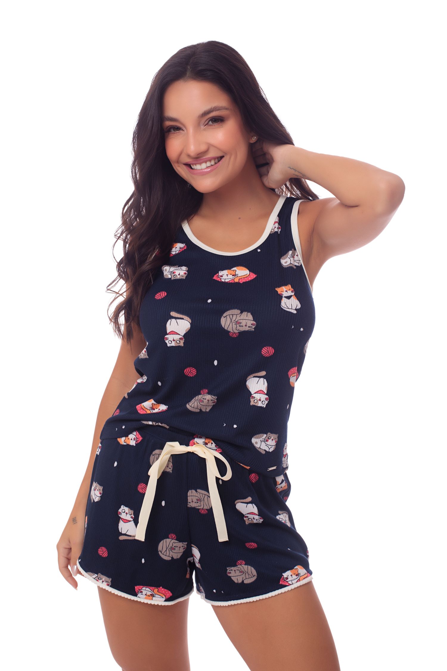 Short doll Amora, confeccionado em malha Liberty super fofa e macia, garantindo conforto e delicadeza ao vestir. Disponível em quatro estampas encantadoras, o conjunto traz uma blusa estilo regatinha, com acabamento em viés nas cavas e na gola, que adiciona um toque de charme e capricho. O short, de modelagem ajustada e confortável, é complementado por um delicado laço (não funcional) no mesmo tom do viés da blusa, criando uma harmonia visual perfeita. Uma peça que une frescor, feminilidade e fofura em cada detalhe.