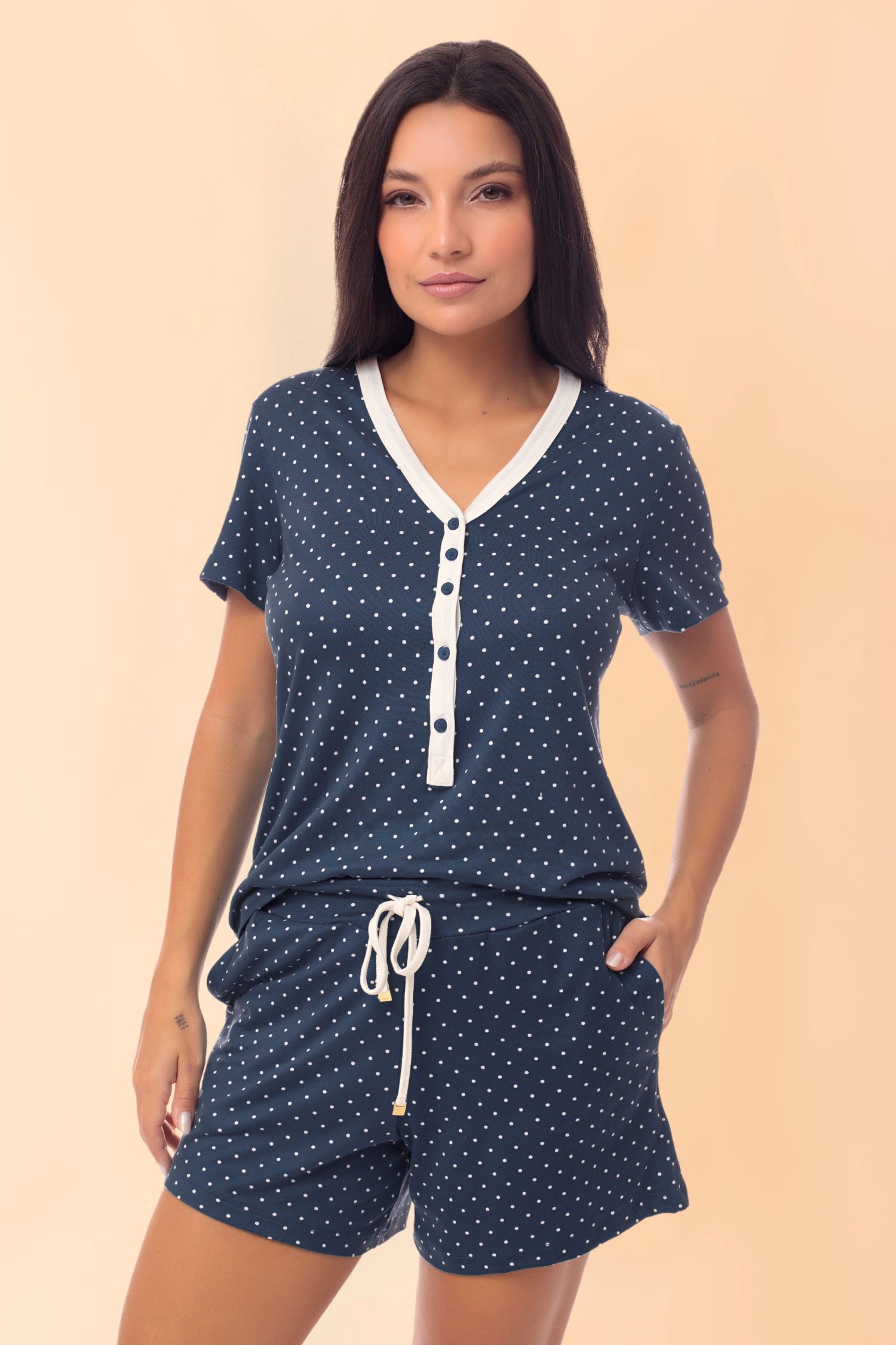 Short Doll em Suede Light estampado em poás com acabamentos lisos contrastantes, este produto possui um estilo mais casual. Já é um clássico da marca por conta da excelente aceitação, e por isso ele se renova a cada coleção em cores e estampas. O destaque desta modelagem está no cós perfeitamente ajustável e sem elástico o que agrada muito as mulheres, especialmente aquelas que passaram por algum procedimento cirúrgico. A blusa, além de bonita, pode ser funcional, pois sua abertura permite a amamentação. Esta malha é macia e tem um toque que lembra a suavidade da pele de pêssego. Este produto pode ser considerado uma boa opção para grávidas ou puérperas que são mais casuais e priorizam o conforto.