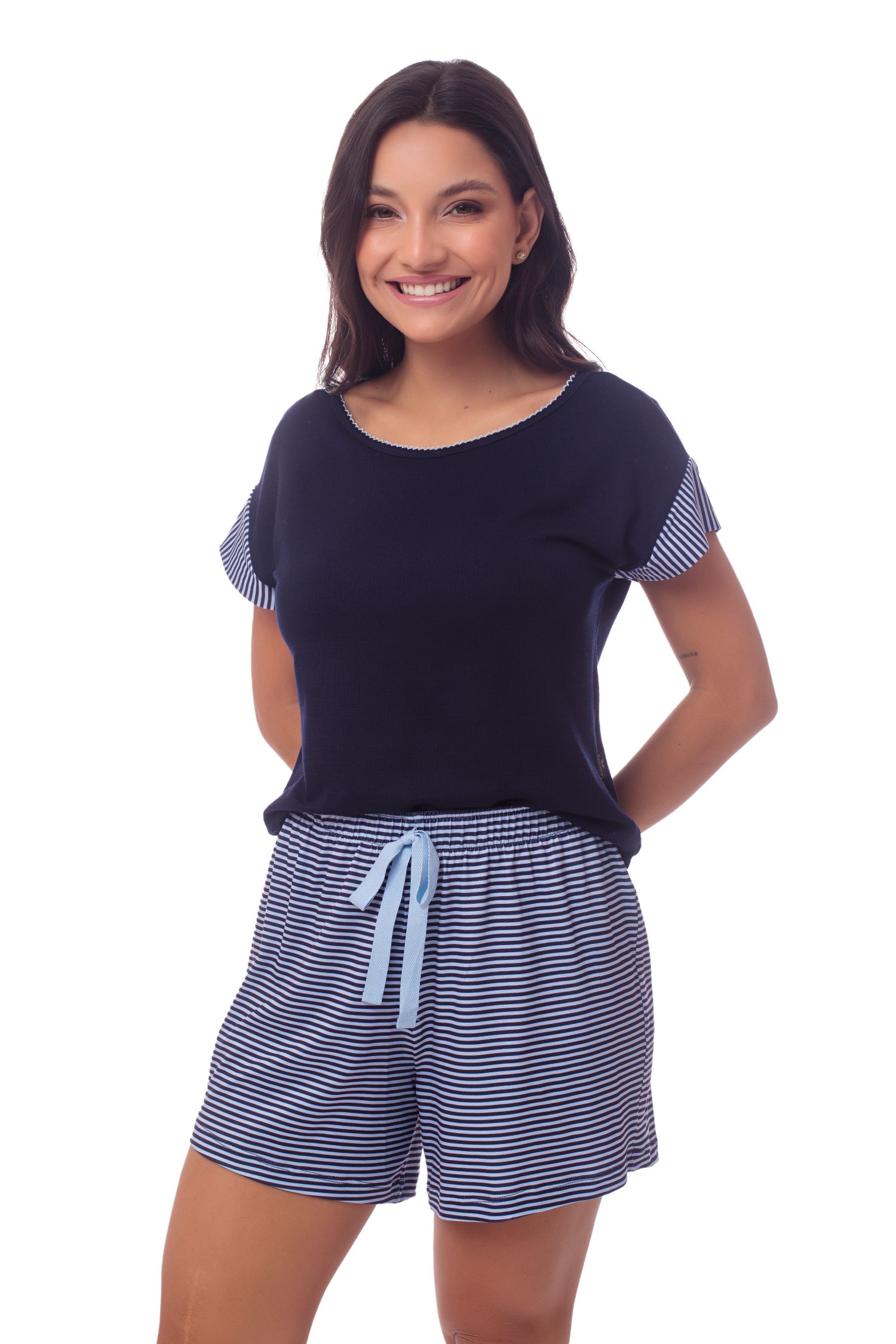 O Short Doll Carmela foi pensado para a mulher que gosta de praticidade. A blusa em modelagem solta produzida na malha Vicenza traz frescor e caimento, proporcionados pela junção da viscose com o elastano. Já o short listrado em fake suede tem comprimento confortável e toque muito macio. No decote, detalhes em picueta, uma espécie de ponto de crochê, dão charme ao modelo.