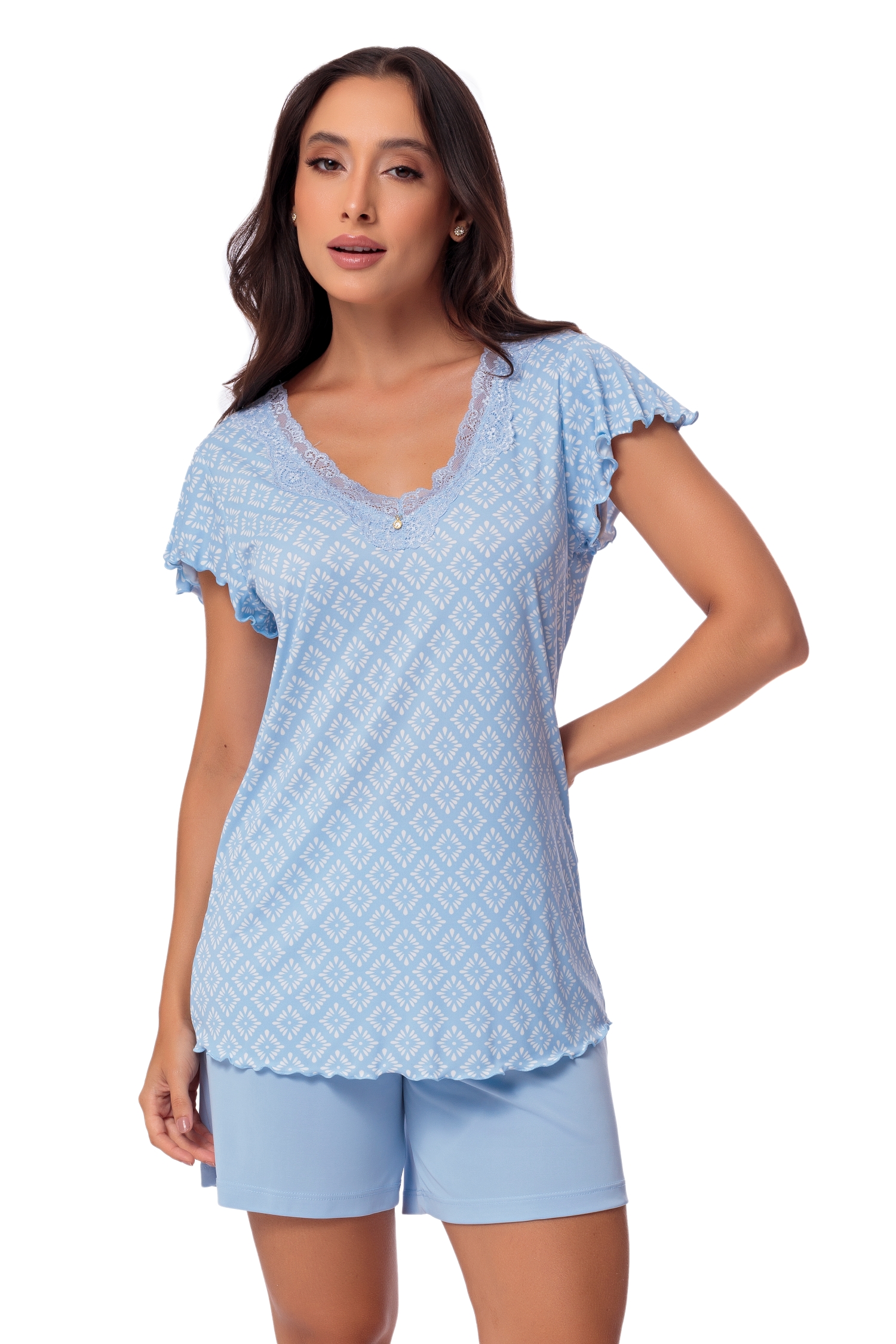 O short doll Celeste é um produto clássico da marca. Produzido em Plume, uma poliamida leve e fluida, de alta durabilidade, popularmente conhecida como ?malha fria?, traz uma modelagem com blusa solta, decote em ?V?, revestido por uma delicada renda e aplique de pingente tipo jóia. Mangas curtas formando babados e short com comprimento confortável. A malha lisa do short foi desenvolvida a partir da perfeita combinação entre o design e a inovadora tecnologia da poliamida Amni, proporcionando respirabilidade, fácil lavagem e secagem, artigo produzido de forma sustentável.