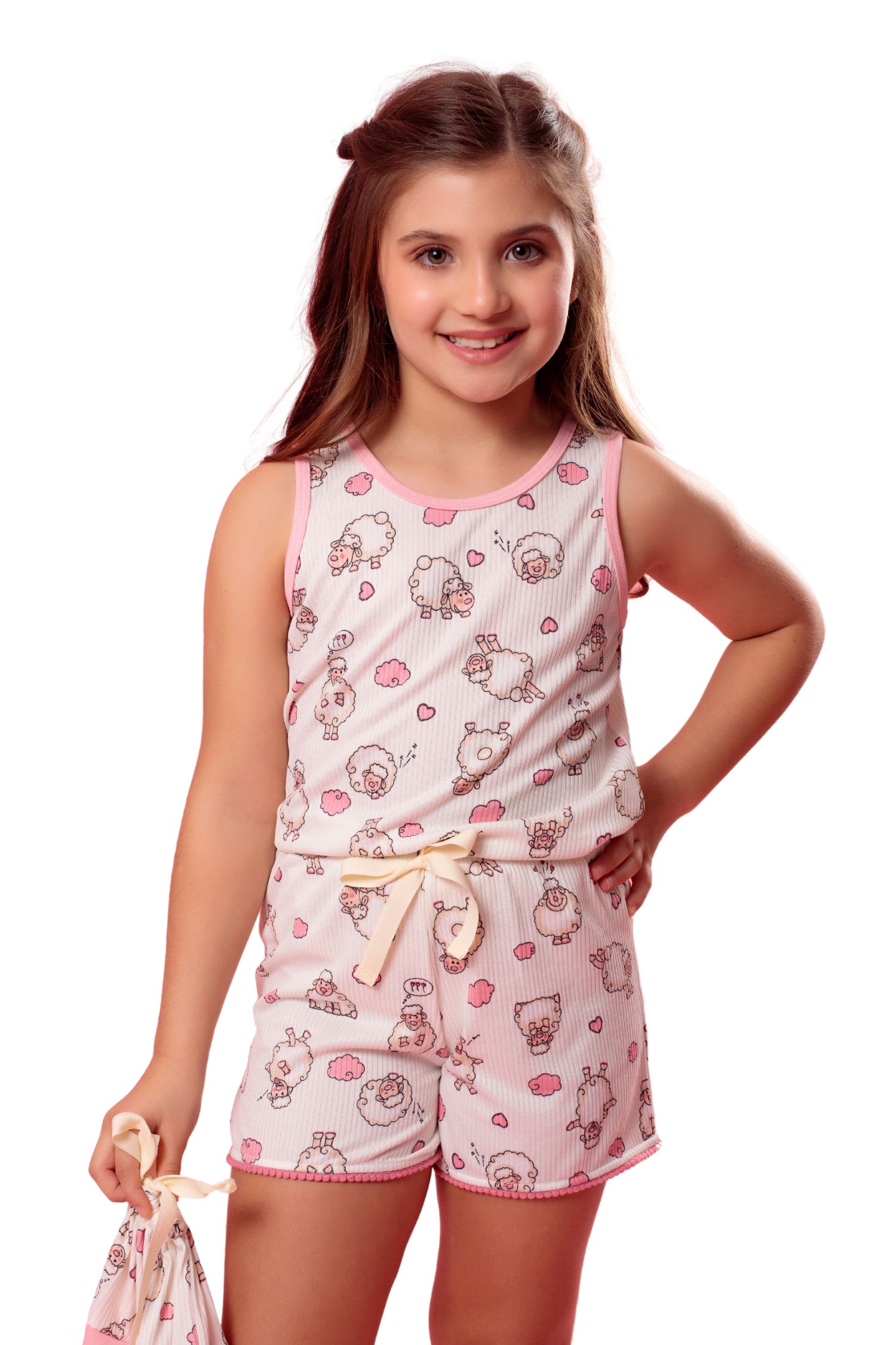 Short doll Amora, confeccionado em malha Liberty super fofa e macia, garantindo conforto e delicadeza ao vestir. Disponível em quatro estampas encantadoras, o conjunto traz uma blusa estilo regatinha, com acabamento em viés nas cavas e na gola, que adiciona um toque de charme e capricho. O short, de modelagem ajustada e confortável, é complementado por um delicado laço (não funcional) no mesmo tom do viés da blusa, criando uma harmonia visual perfeita. Uma peça que une frescor, feminilidade e fofura em cada detalhe.