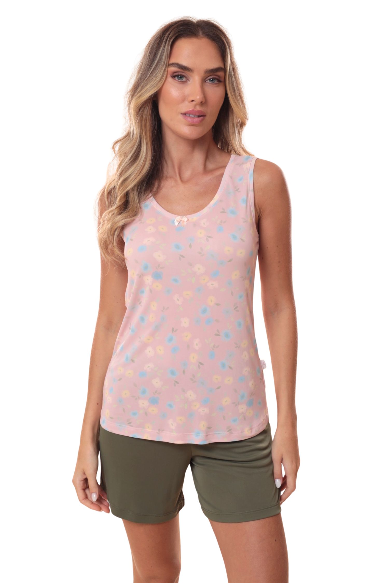 Short Doll composto por blusa regata produzida em poliamida Plume, malha leve e fluida, de alta durabilidade, popularmente conhecida como ?malha fria? e short de comprimento confortável. É básico e atemporal. A blusa é estampada