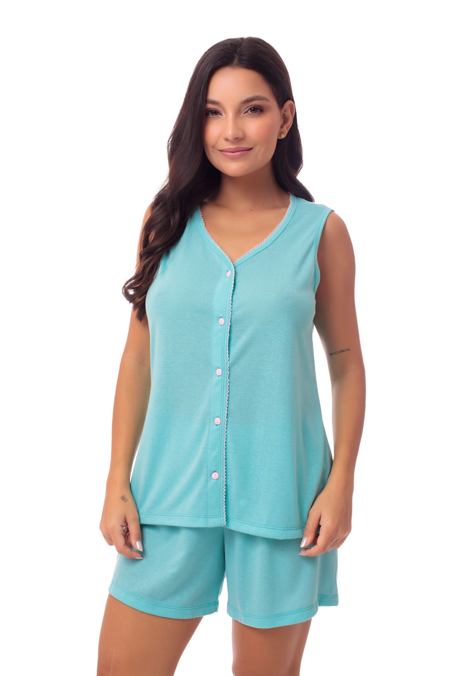 preferência por fibras naturais, frescas e confortáveis. A modelagem é cavada e a abertura frontal favorece todas as pessoas, mas em especial as lactantes e também pessoas que estão em recuperação cirúrgica, etc., facilitando o uso e o vestir. O short tem comprimento confortável. O contraste colorido dos botões trazem jovialidade ao modelo; e o acabamento final fica por conta da picueta, uma espécie de ponto de crochê que reveste toda a abertura da blusa. Um modelo que traz simplicidade e conforto!