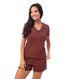 Conjunto confeccionado em malha leve de texturizada, com elasticidade equilibrada que proporciona conforto e excelente caimento. O tecido é fresco e respirável, ideal para dias quentes. Apresenta modelagem mais soltinha no corpo, favorecendo a liberdade de movimentos. A blusa conta com decote em V adornado por renda tom sobre tom e detalhe delicado de laço central, que acrescenta feminilidade ao visual. Nas mangas e na barra do short, o acabamento em fru fru garante um toque romântico e sofisticado, reforçando o apelo delicado da peça.