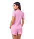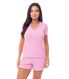Conjunto confeccionado em malha leve de texturizada, com elasticidade equilibrada que proporciona conforto e excelente caimento. O tecido é fresco e respirável, ideal para dias quentes. Apresenta modelagem mais soltinha no corpo, favorecendo a liberdade de movimentos. A blusa conta com decote em V adornado por renda tom sobre tom e detalhe delicado de laço central, que acrescenta feminilidade ao visual. Nas mangas e na barra do short, o acabamento em fru fru garante um toque romântico e sofisticado, reforçando o apelo delicado da peça.