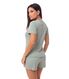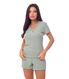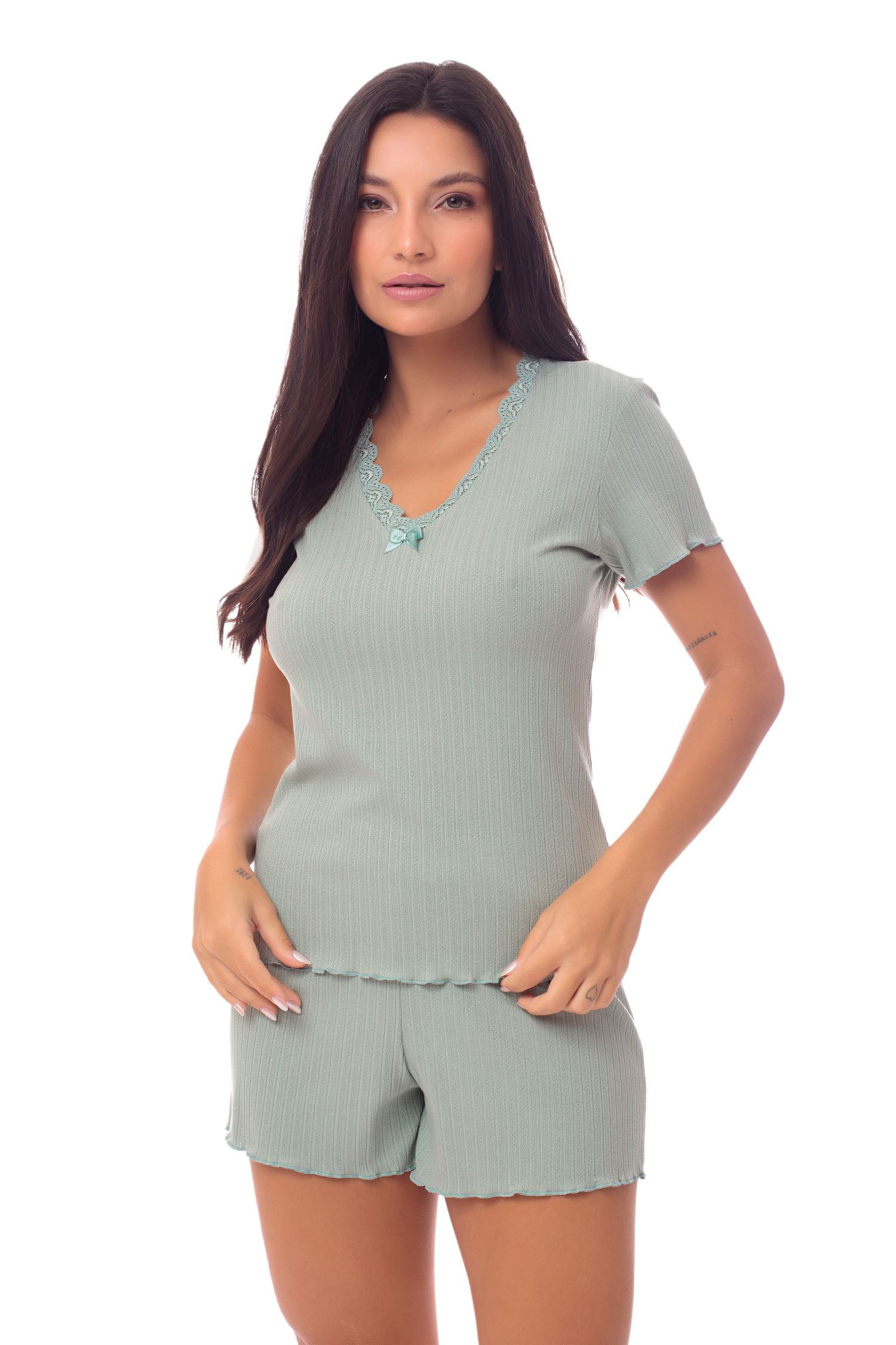 Conjunto confeccionado em malha leve de texturizada, com elasticidade equilibrada que proporciona conforto e excelente caimento. O tecido é fresco e respirável, ideal para dias quentes. Apresenta modelagem mais soltinha no corpo, favorecendo a liberdade de movimentos. A blusa conta com decote em V adornado por renda tom sobre tom e detalhe delicado de laço central, que acrescenta feminilidade ao visual. Nas mangas e na barra do short, o acabamento em fru fru garante um toque romântico e sofisticado, reforçando o apelo delicado da peça.
