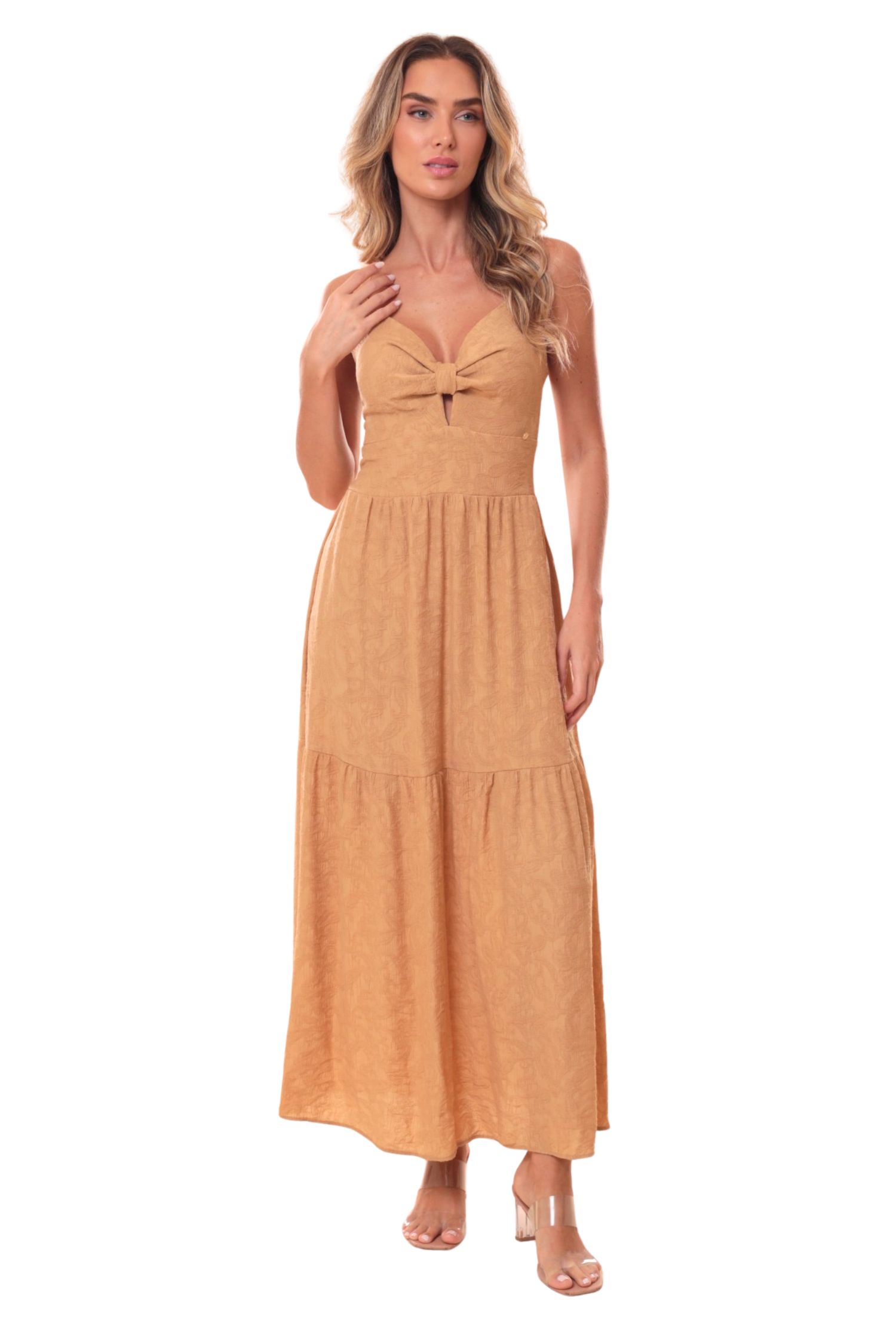 romantismo e elegância. Na composição, fibras nobres como a viscose e a poliamida trazem qualidade, caimento e frescor para o modelo. O vestido Ana é longo com babados franzidos no estilo 3 marias. As alças largas trazem corforto e sua modelagem valoriza o busto. Para se adaptar aos mais diversos biotipos, as costas foram confeccionadas com carreiras de lastex, o que deixa o vestido ainda mais confortável.