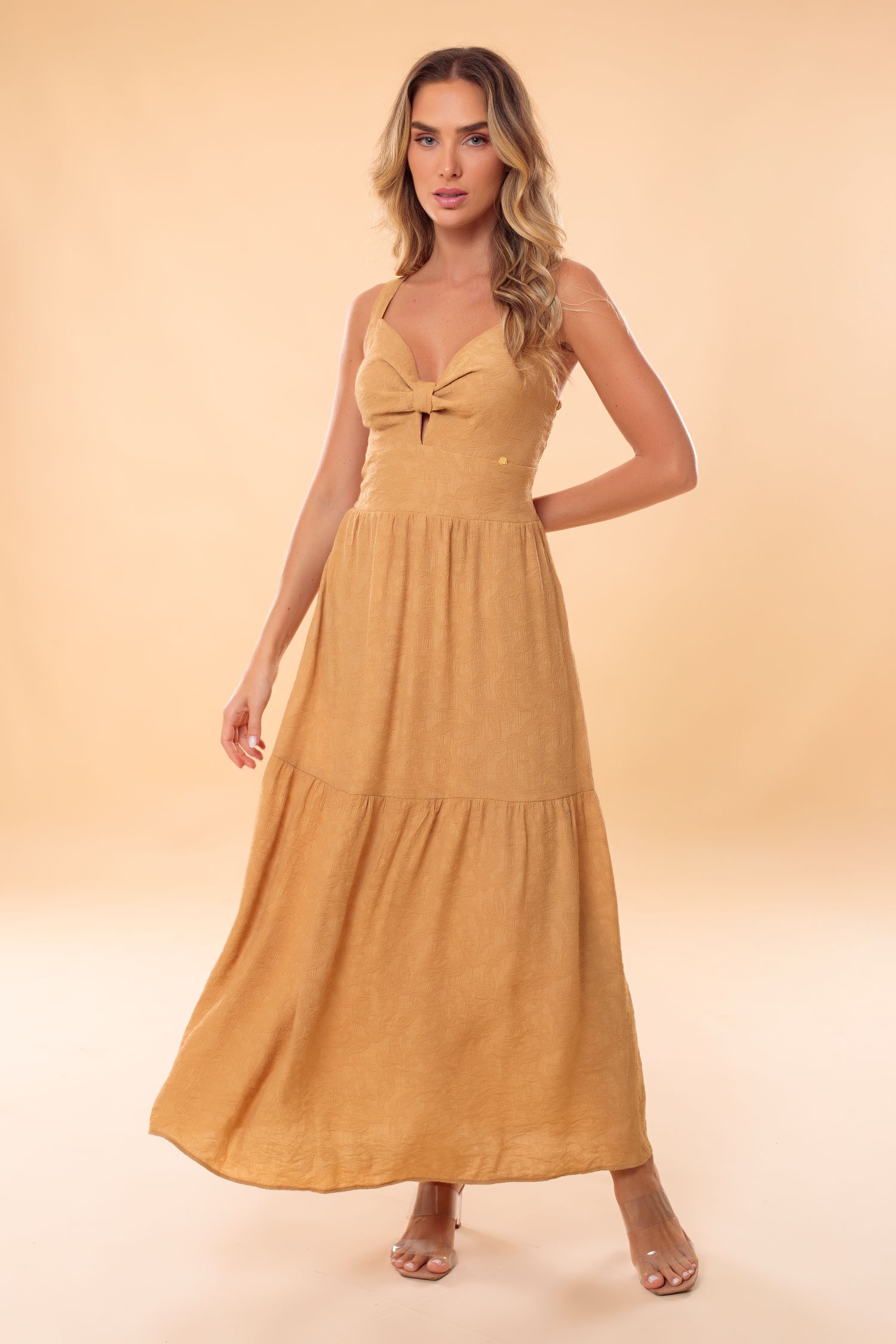 Vestido desenvolvido em tecido plano jacquard, em uma modelagem elaborada que valoriza o corpo da mulher com