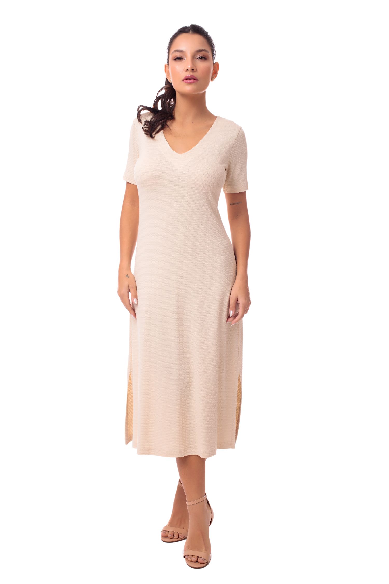 Vestido confeccionado em malha de viscose com elastano, que oferece um caimento leve, fluido e um toque extremamente macio na pele. A presença de elastano garante conforto ao vestir, com ótima elasticidade e liberdade de movimento, sem perder a forma. O modelo possui decote em V, que valoriza o colo com delicadeza e contribui para uma silhueta alongada e elegante. O comprimento midi reforça a sofisticação da peça, tornando-a versátil para diversas ocasiões, do uso casual ao mais elaborado. Uma peça atemporal e confortável, que une leveza, praticidade e estilo com naturalidade.