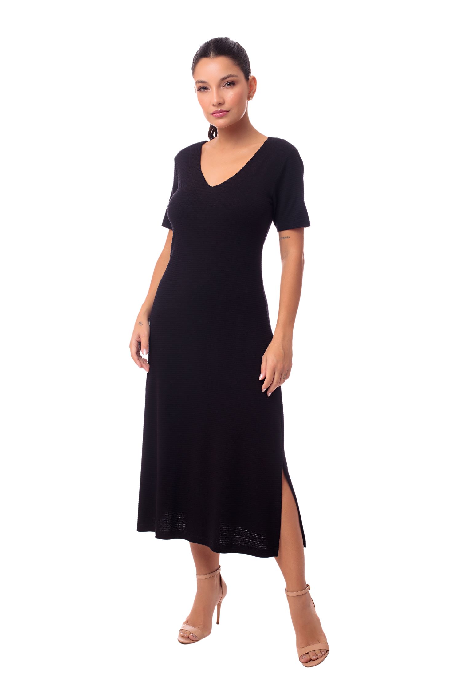 Vestido confeccionado em malha de viscose com elastano, que oferece um caimento leve, fluido e um toque extremamente macio na pele. A presença de elastano garante conforto ao vestir, com ótima elasticidade e liberdade de movimento, sem perder a forma. O modelo possui decote em V, que valoriza o colo com delicadeza e contribui para uma silhueta alongada e elegante. O comprimento midi reforça a sofisticação da peça, tornando-a versátil para diversas ocasiões, do uso casual ao mais elaborado. Uma peça atemporal e confortável, que une leveza, praticidade e estilo com naturalidade.