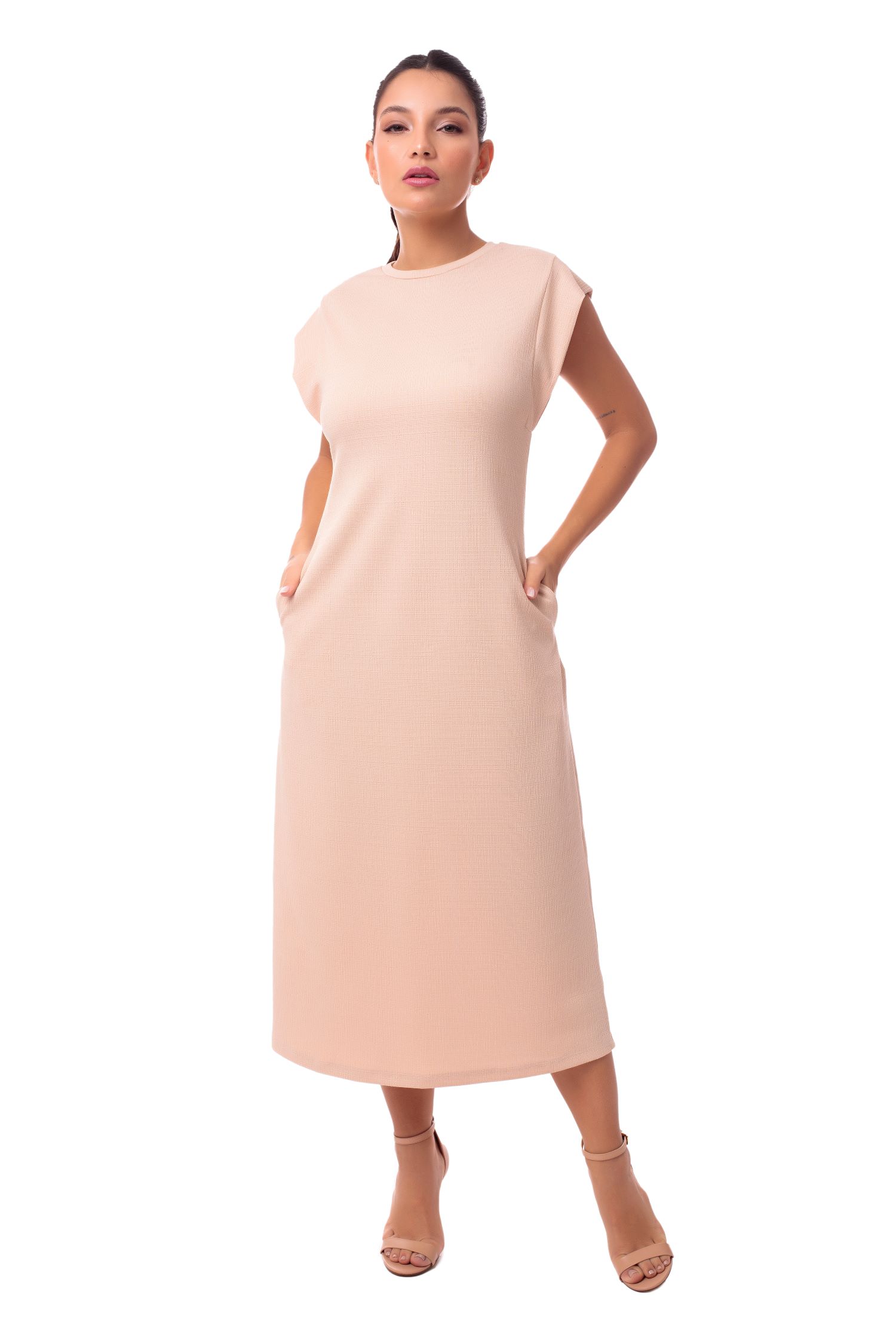 Vestido solto e confortável, confeccionado em modelagem estilo regata com recorte muscle, que traz um ar moderno e despojado à peça. Possui bolsos embutidos laterais, práticos e funcionais, sem comprometer a fluidez do caimento. Na parte de trás, apresenta fenda discreta, que garante maior liberdade de movimento e um toque de charme ao visual. Versátil e atemporal, é uma opção perfeita para composições casuais com elegância natural.